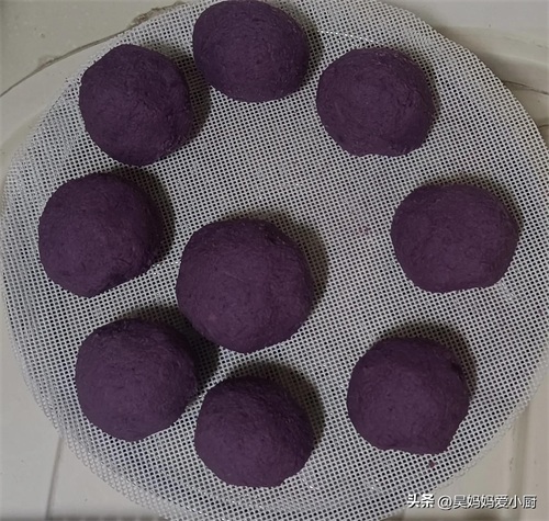 先把紫薯泥和成面团,揪成100克左右的圆团,里面加上自己喜欢吃的馅料,二次团成圆团。