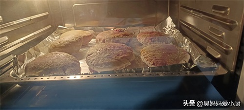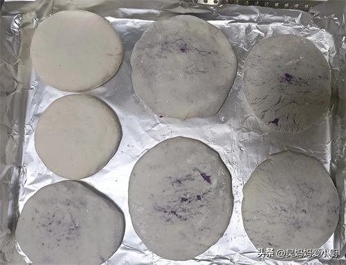 把稍微醒发好的面团揪成30克左右的剂子,擀成直径为13厘米的圆,把紫薯团包进去。提前五分钟预热烤箱。圆团外面刷上一层蛋液。烤箱155度20分钟,中间记得翻面。做出来的糯米紫薯饼软糯香甜,如果是加了芝士的紫薯饼吃起来会拉丝。