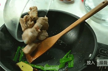 2、排骨放入盛水的锅里,水开后舀出浮沫。