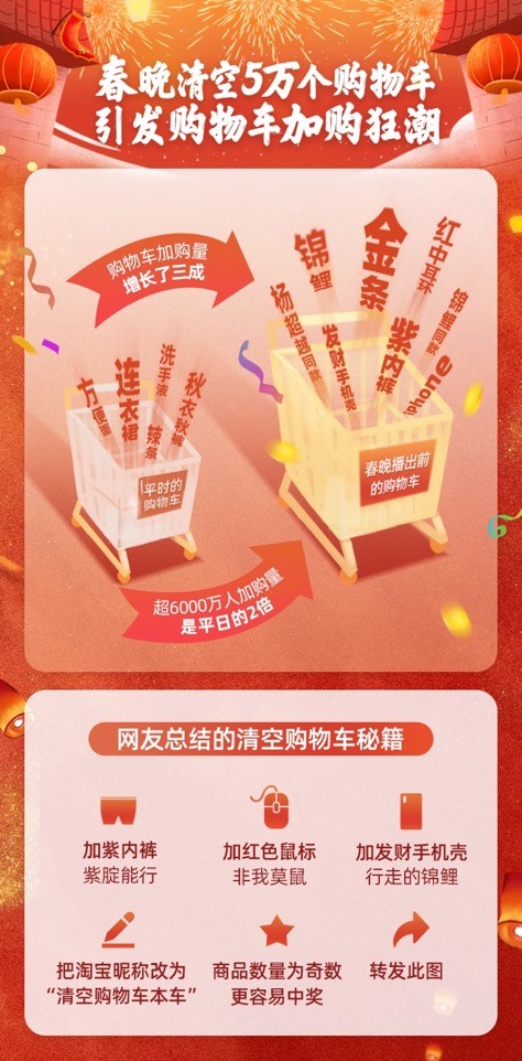今天,淘宝首页上线了非常重要的一句话:春晚清空5万个购物车
