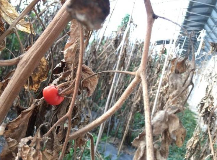由于无人打理,有些温室大棚都没有上锁。推开门进去,上季余下的小西红柿还挂在枝头,本该种植草莓、蔬菜地垄间,杂草横生。