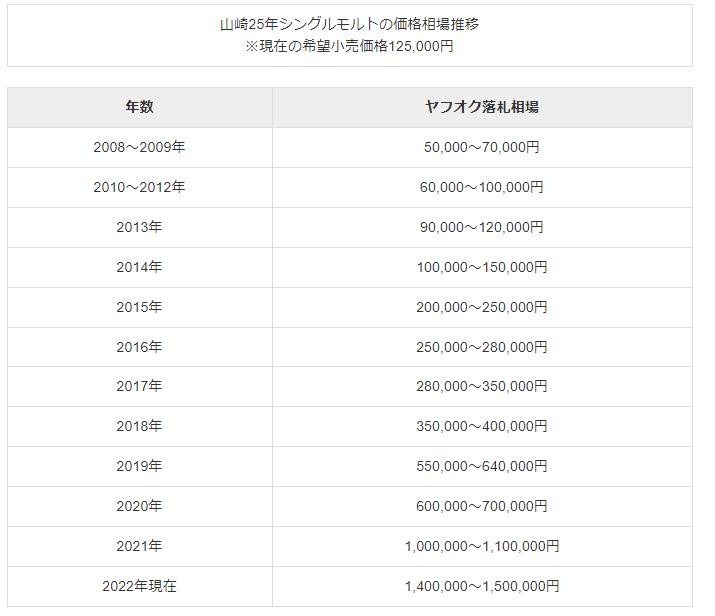 2008年左右,一瓶山崎25年的价格是5~7万日元,而到了2022年它们的价格达到140万~150万!,是10年前的20倍。