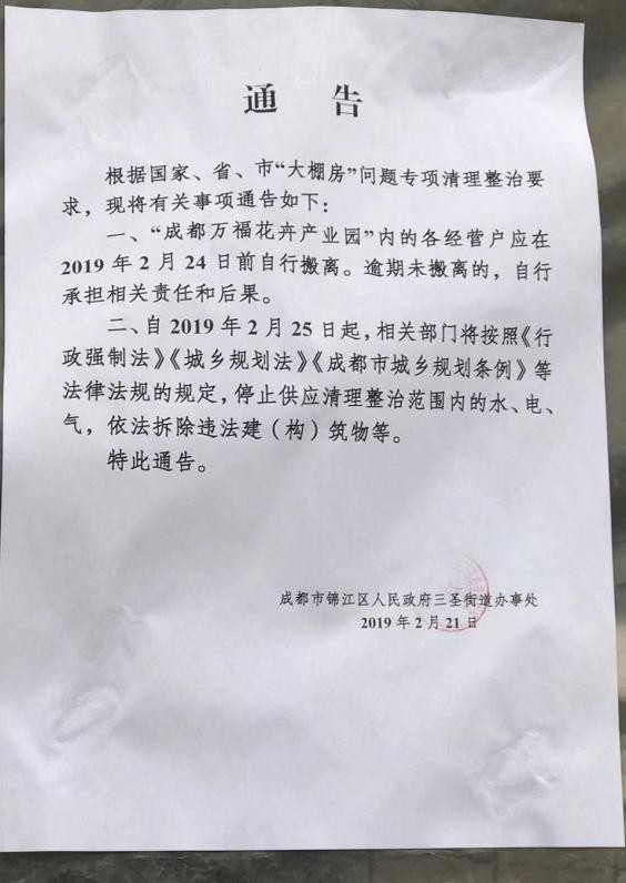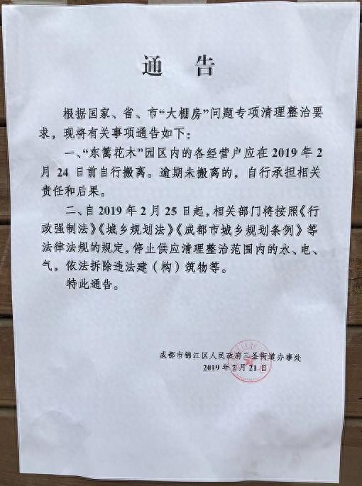 天府早报记者从成都市锦江区三圣街道办21日张贴进花市中的通告得知,东篱花木市场和万福花卉产业园等市场内的各经营户要在24日前自行搬离。对于逾期未搬离市场的,通告还明确从25日起,相关部门将按照《行政强制法》《城乡规划法》《成都市城乡规划条例》等法律法规的规定,停止供应清理整治范围内的水电气,依法拆除违法建(构)筑物等。