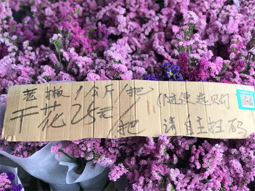 刘女士的鲜切花店内,用马克笔在纸板上写的几个大字尤其显眼:特价处理,干花25元/把(1公斤)。“你安心买的话一公斤算你二十,一束就是一公斤哈,放心嘛,真的很优惠了。”刘女士表示,像眼下卖的干花平时都是小把小把地卖,10元一把,现在为了尽快卖出去,干脆直接称斤数捆扎着一起甩卖。“这边的干花算你们二十,这边包好的鲜花也是二十哈。”刘女士不停地招呼着不断涌入的客人说,“平时一束要卖五六十的玫瑰、百合,现在都卖二十五到三十哈。”