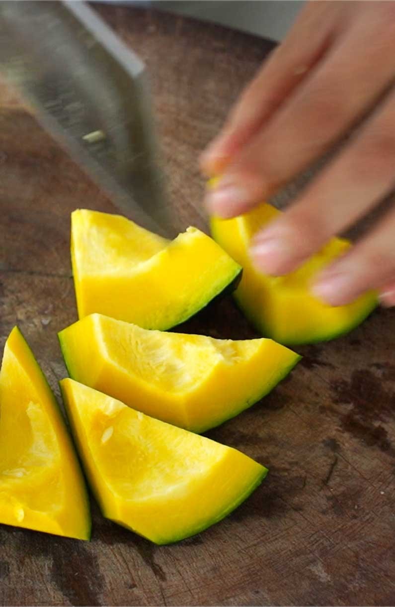 然后再将贝贝南瓜切成大小合适的块儿,南瓜的皮不用削掉。将切好的南瓜放进大碗之中。