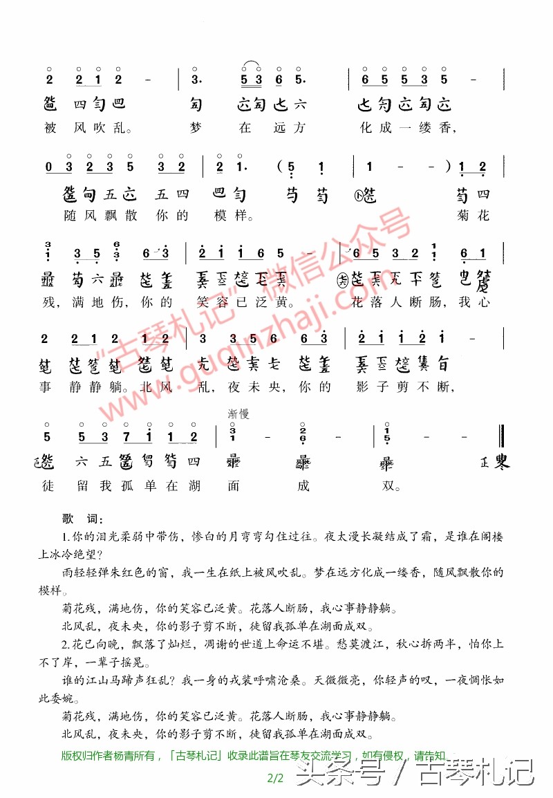每日一谱丨古琴减字谱《菊花台》 编配:杨青