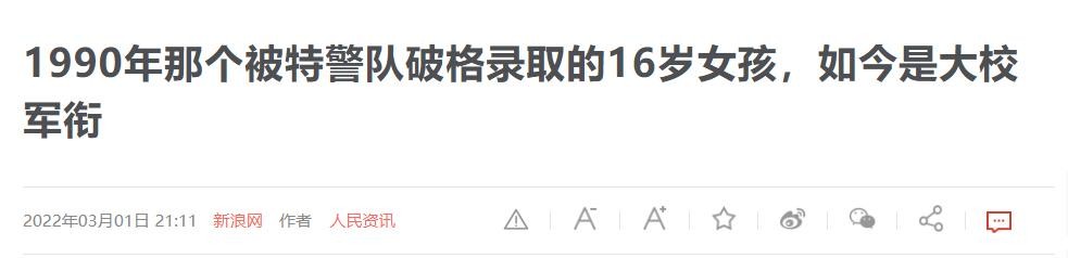 信息来源:人民资讯-2022-03-01-1990年那个被特警队破格录取的16岁女孩,如今是大校军衔