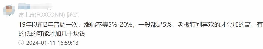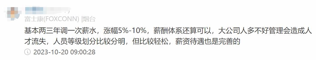 富士康员工原话:基本两三年调一次薪水,涨幅5%-10%,薪酬体系还算可以。大公司人多不好管理会造成人才流失,因此人员等级划分比较分明。