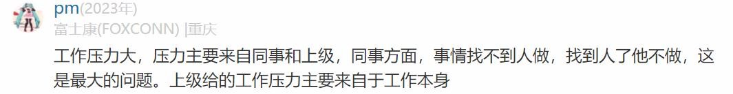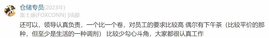富士康员工原话2:工作氛围一般,有很多推诿拖拉的人,毕竟待遇给的低,很多人都是能拖就拖。公司小领导的话,很多时候也是受限于公司框架和上司,有很多的无能为力。