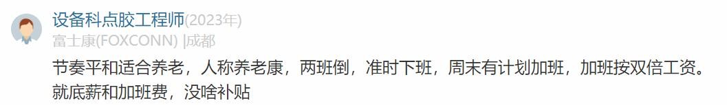 富士康员工原话1:节奏平和适合养老,人称养老康,两班倒,准时下班,周末有计划加班,加班按双倍工资。就底薪和加班费,没啥补贴