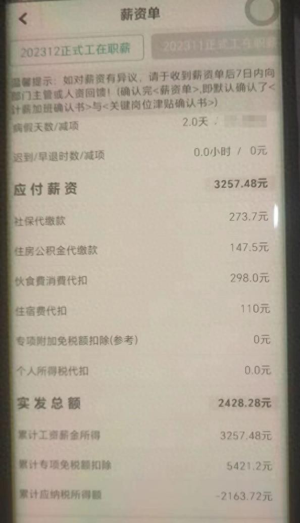 这位朋友提供的2023年12月薪资截图显示,正常工作天数21.75天,应发工资3257.48元,实发工资2428.28元。社保代缴273.7元,公积金代缴147.5元,住宿代扣110元。
