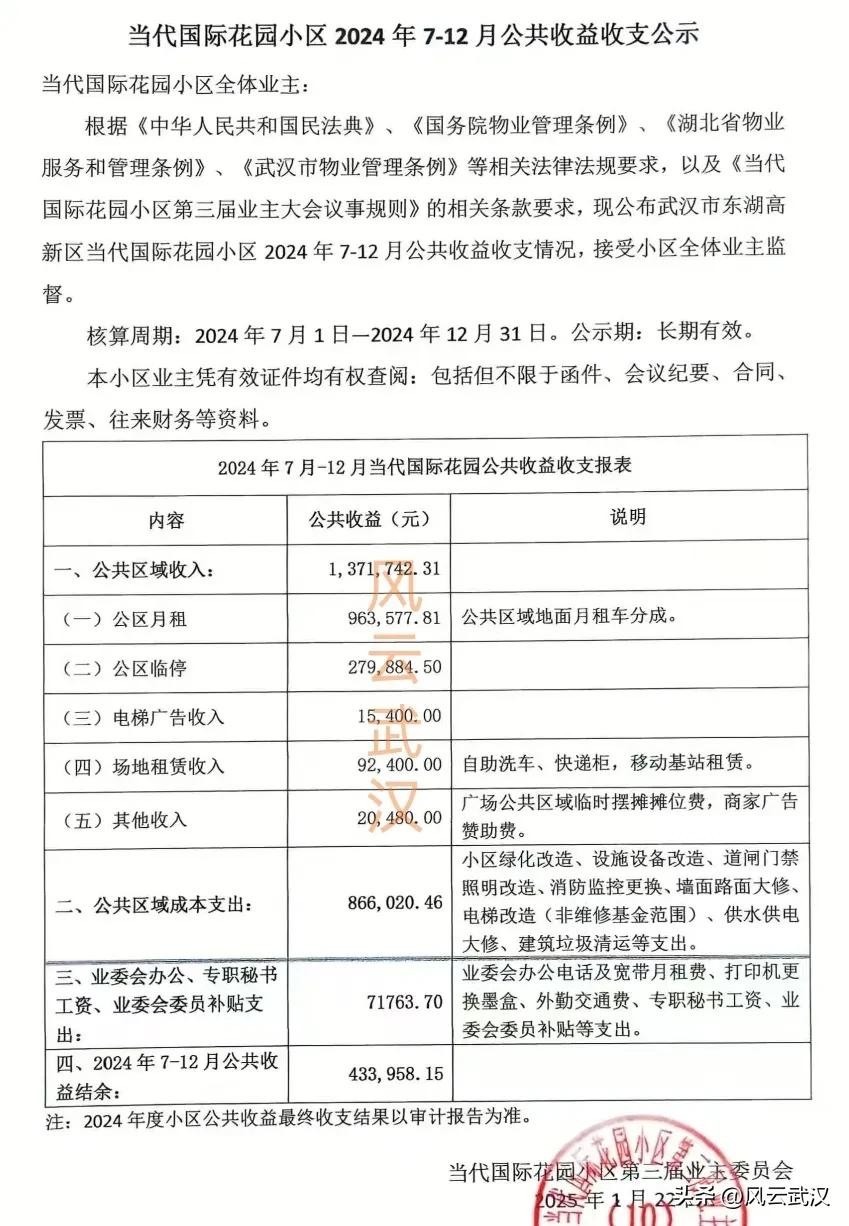 位于光谷的当代国际花园小区,两年前,小区还是负债7万;收回公共收益之后,现在每年都有数百万公共收益。(从负债7万到每年数百万盈利,这其中的猫腻,你品你细品!)
