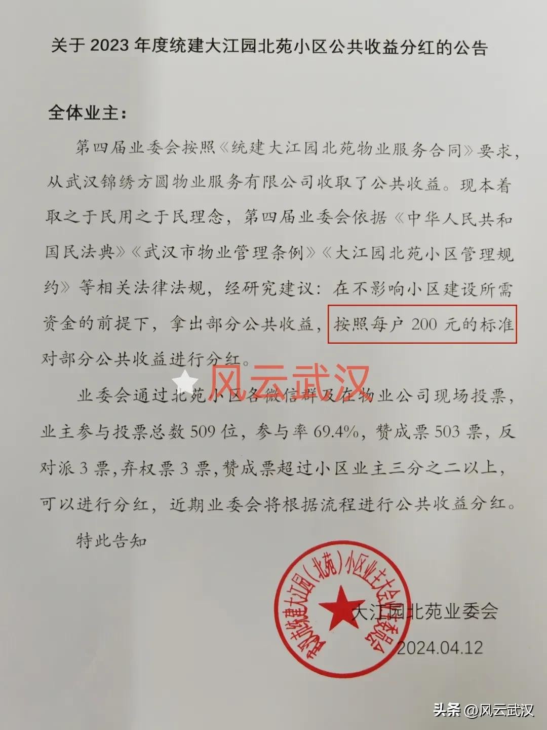 位于江岸区的统建大江园北苑小区收回公共收益后,按照“取之于民用之于民”的原则,按照每户200元的标准对公共收益进行分红。