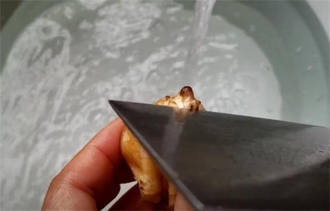 3.然后再用刀将这种嫩芽给削掉,嫩芽不好保存,而且也会影响口感,吃起来软软的不脆。