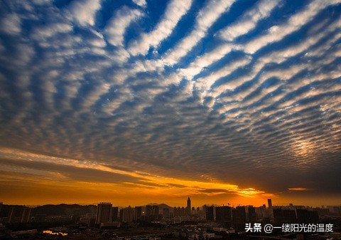 “鱼鳞云”在气象学上叫“透光高积云”,是秋冬季强冷空气来时出现的一种天气现象。民间有“天现鱼鳞云,不雨风也颠”,预示近期天气会不稳定的说法。