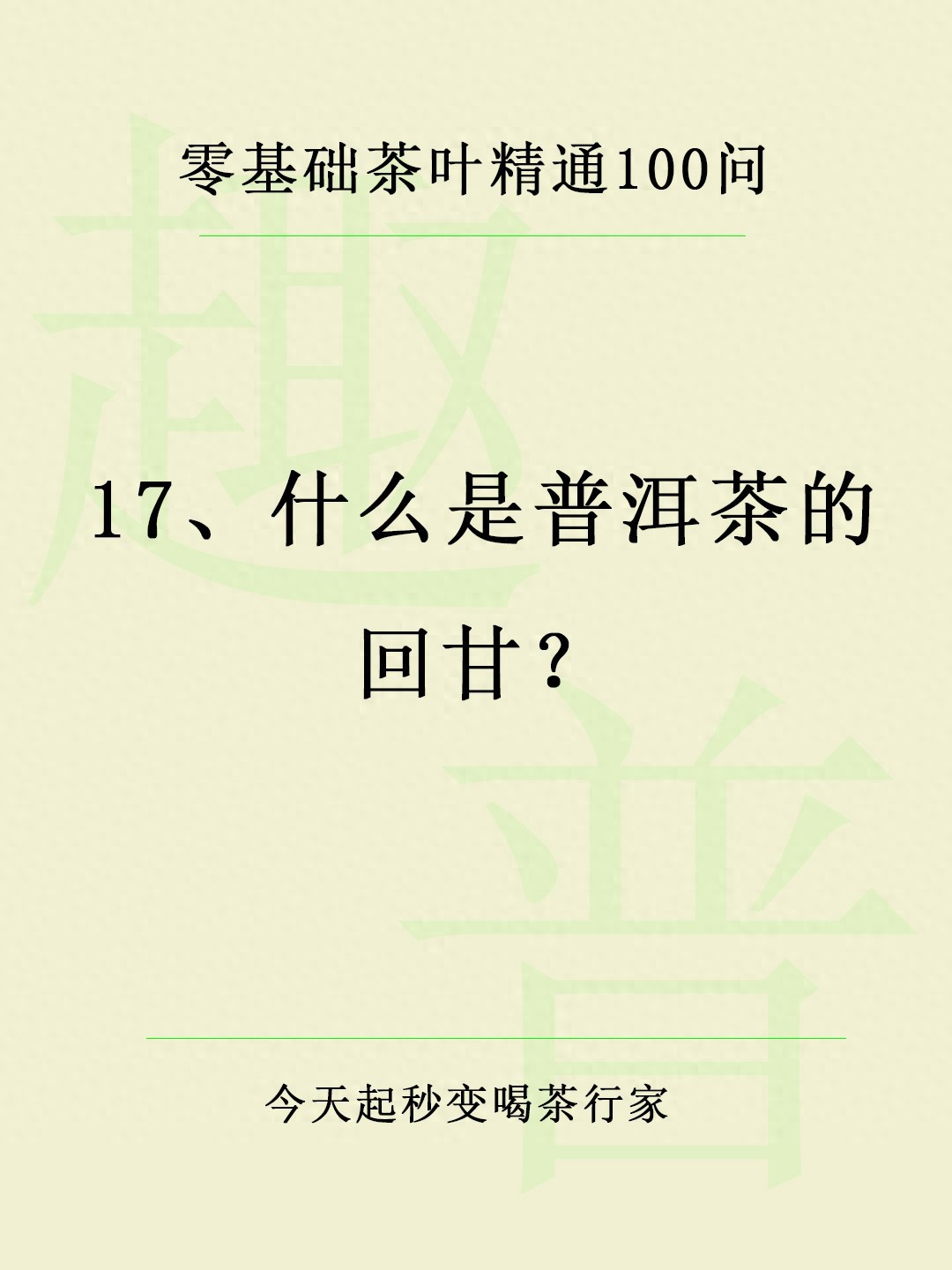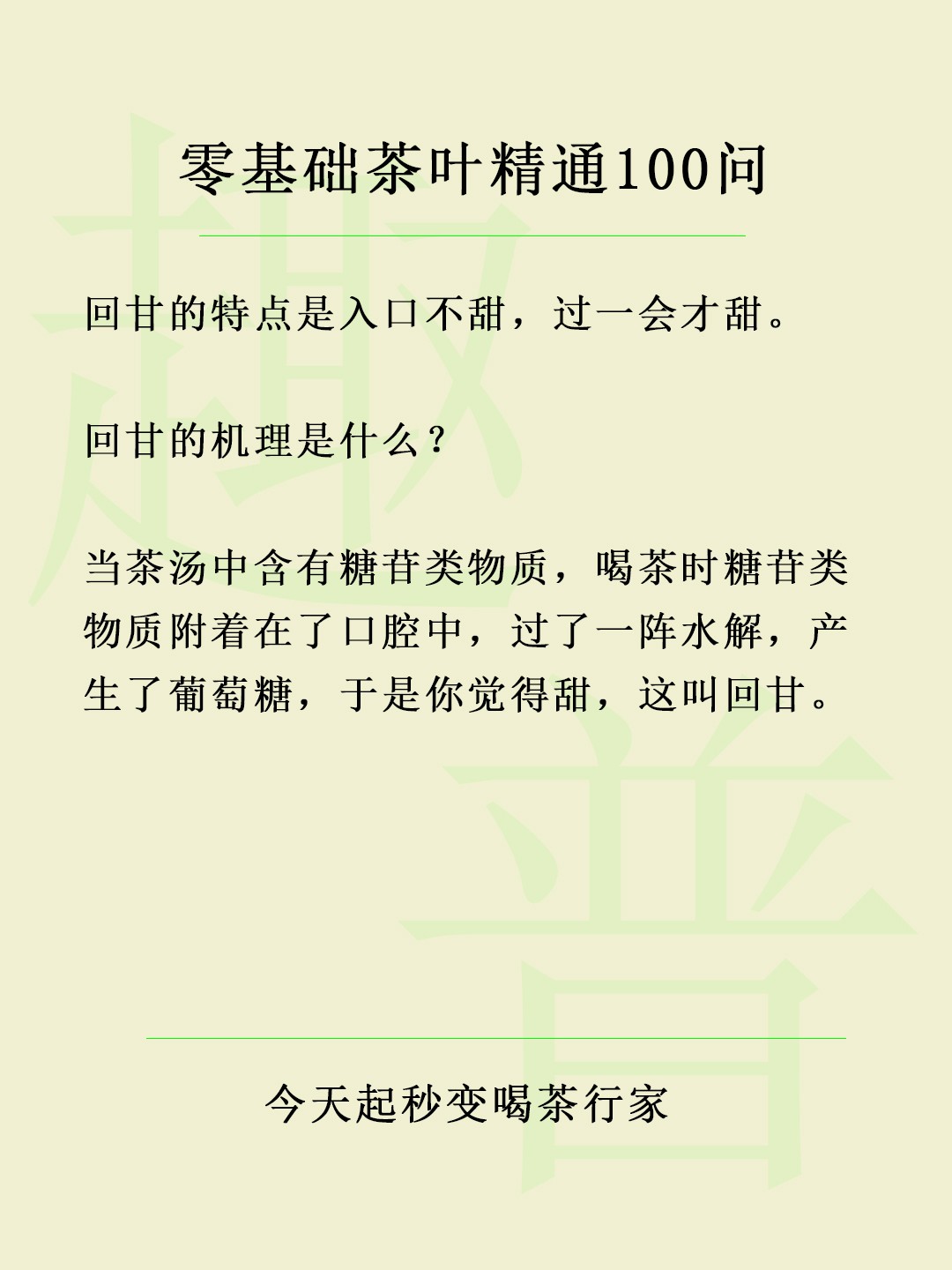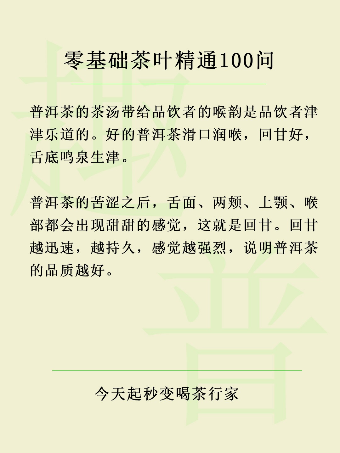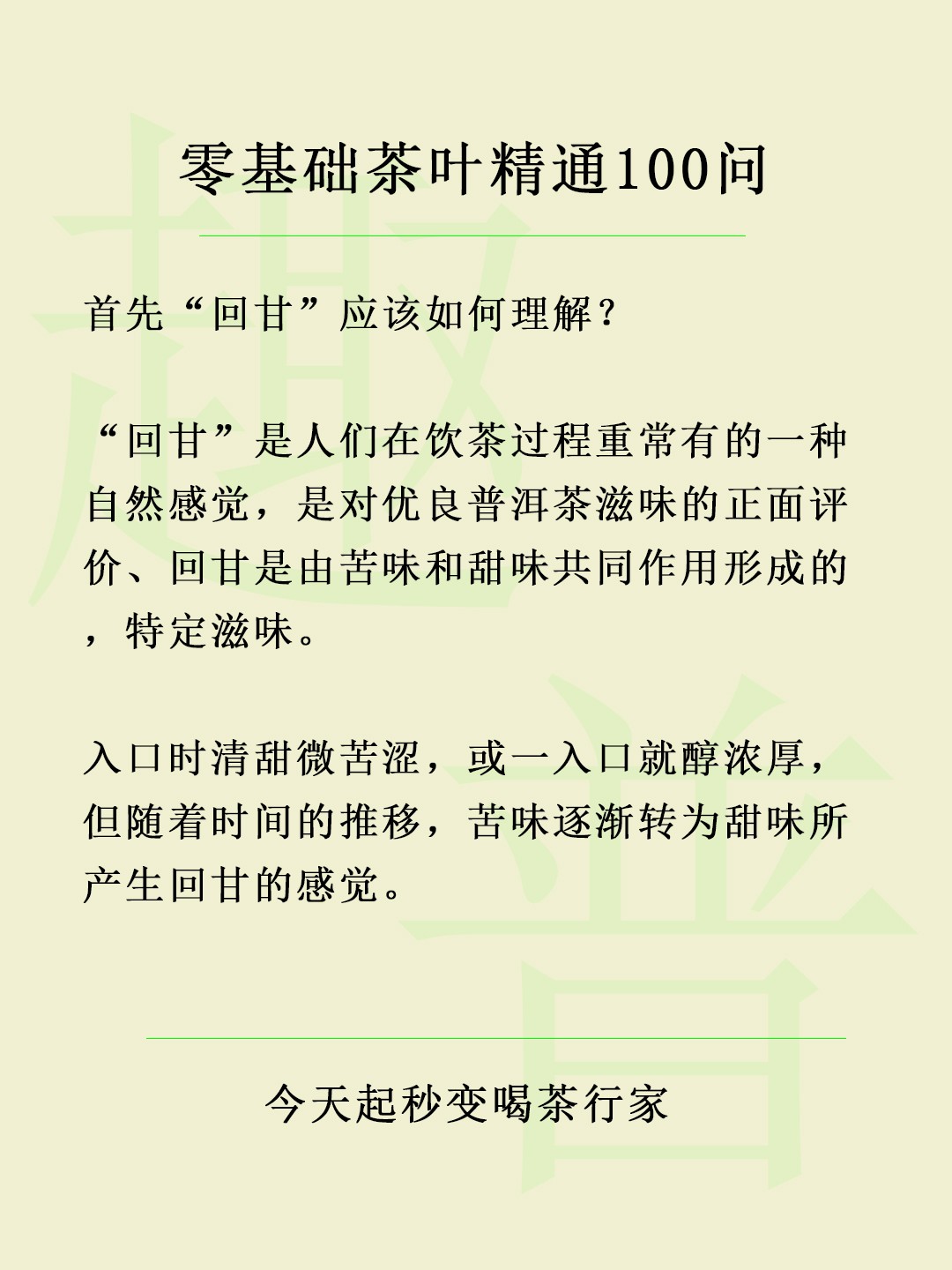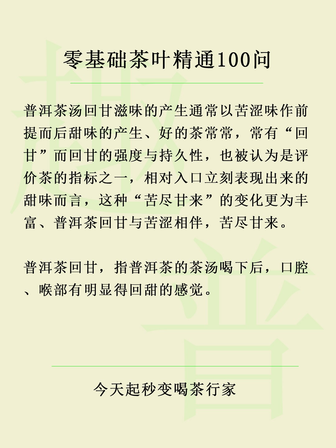 普洱茶汤回甘滋味的产生通常以苦涩味作前提而后甜味的产生、好的茶常常,常有“回甘”而回甘的强度与持久性,也被认为是评价茶的指标之一,相对入口立刻表现出来的甜味而言,这种“苦尽甘来”的变化更为丰富、普洱茶回甘与苦涩相伴,苦尽甘来。普洱茶回甘,指普洱茶的茶汤喝下后,口腔、喉部有明显得回甜的感觉。