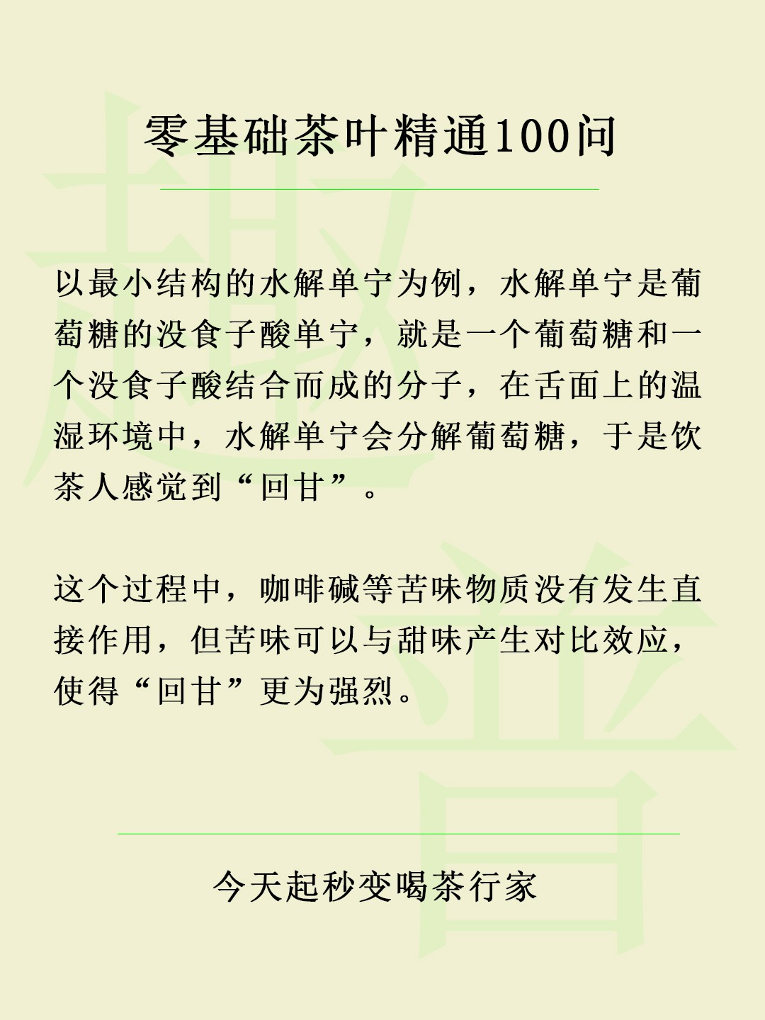 当茶汤中含有糖苷类物质,喝茶时糖苷类物质附着在了口腔中,过了一阵水解,产生了葡萄糖,于是你觉得甜,这叫回甘。