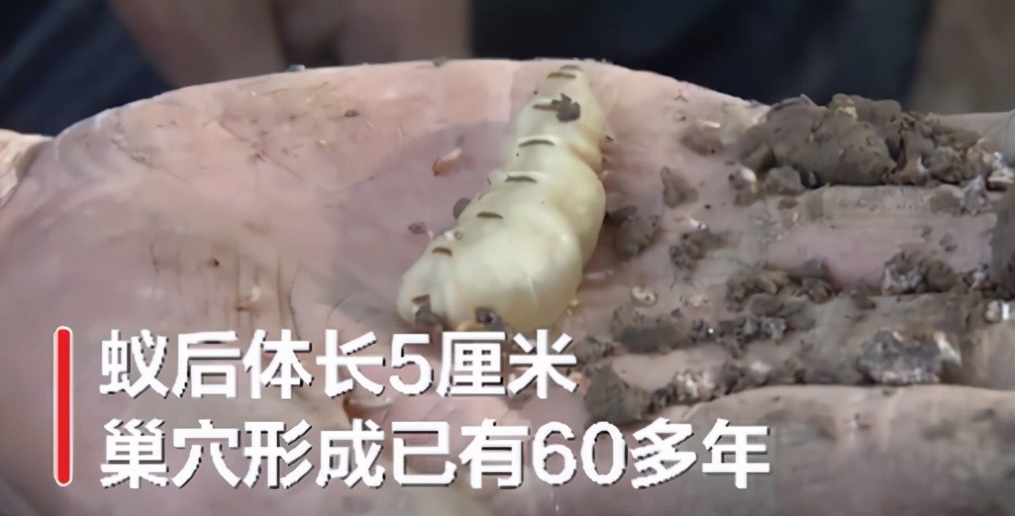 近日,在湖北开展白蚁整治的时候,发现了一个超大蚁穴,据专家说,这个蚁穴已经有六十年的历史了,其中的蚁后长达5厘米,和人的手指有得一拼了。很多网友表示:看着鸡皮疙瘩都起了。