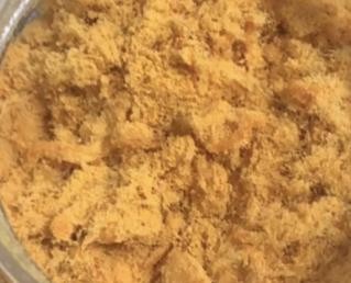 而添加熟豆粉的肉粉松颜色往往是里面较浅白,外面颜色较重,可以明显看到粉状物,手一捏就粘在一起。