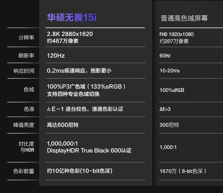 除了性能表现之外,这个价位段的轻薄本,在屏幕素质上也是有着非常大的差别的,像华硕无畏15i 2023起所使用的的是一块15.6英寸的OLED屏幕,这也是近几年华硕一直在普及的#华硕好屏#,这块OLED屏幕既拥有2.8K分辨率、120Hz的刷新率,同时在色彩上还拥有100% P3广色域覆盖以及支持10-bit色深的素质,并且支持四种专业色域切换,日常看剧、图片制作、视频制作都能有更好的显示效果,可以说是兼具了娱乐性和专业性。