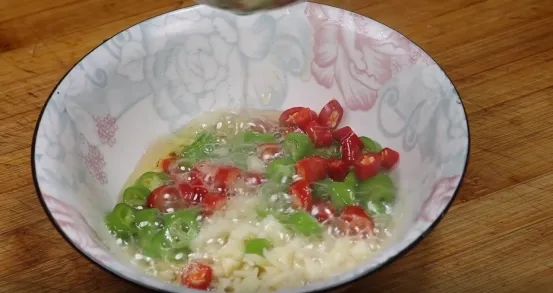 3:锅中提前烧热油,烧热后浇入蒜末碗中,用高油温激发出蒜香味。然后再加入适量食用盐、白糖、两勺生抽、再加入一勺白醋。把调料先搅拌化开。