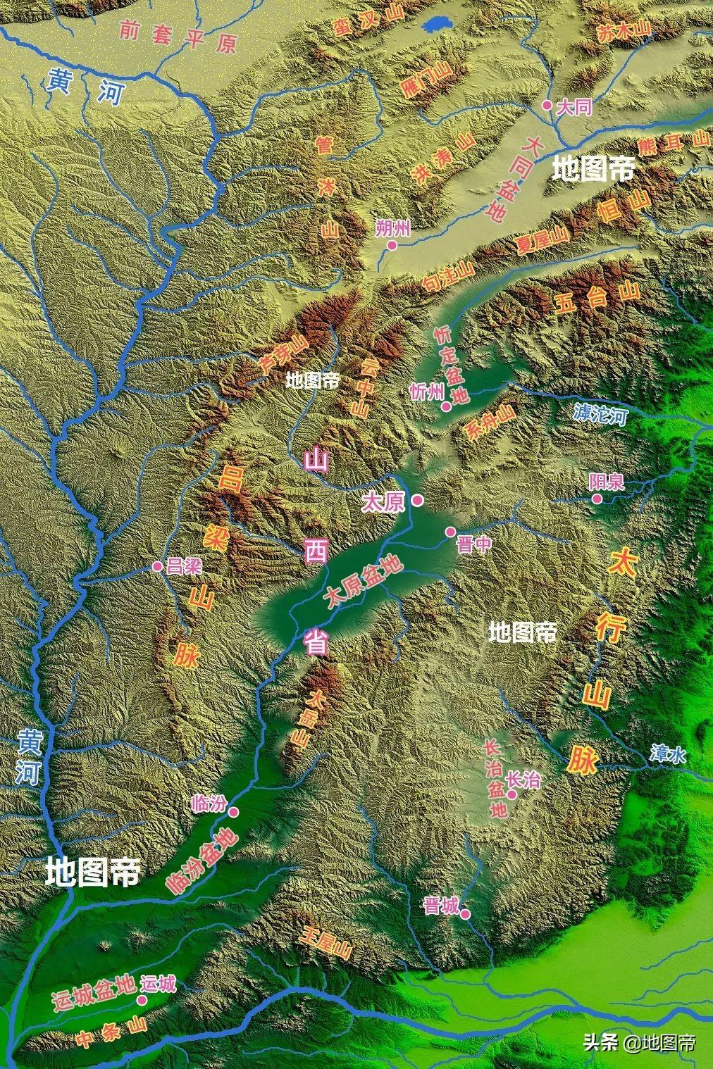 山西省是个山地高原省份,全省基本处在黄土高原的东翼,大部分地区的平均海拔都在1000米以上。在全省面积中,80%是山地和丘陵,剩下的20%多是盆地(含台地)。山西地形一个非常显著的特点,就是盆地较多,而且山西的盆地差不多呈一条线,从北至南狭长分布。另外就是,每一条狭长的盆地基本上都会流经一条大河。