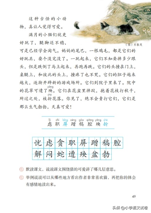 课文配有插图,为著名画家米春茂的作品。图中的小猫栩栩如生,虽然腿脚还不稳,却和一根鸡毛玩的不亦乐乎,真是活泼可爱、富有生机。插图对小猫的神情、动作都刻画的细致入微、生动传神,课文中所描写的小猫的淘气,都惟妙惟肖地传达出来了。