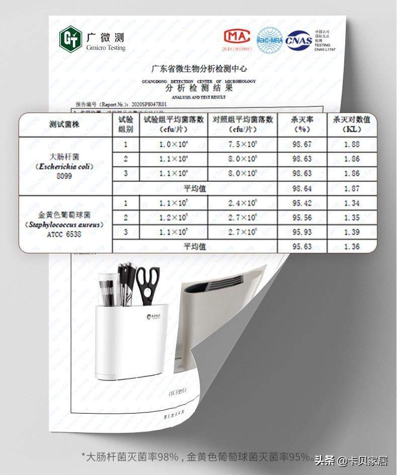 使用起来并不复杂,把刀具筷子放进去之后,轻触顶部的按钮就能开始工作,一键式操作,简单快捷,上手就会。这款刀架里面装配的是高性能的UV紫外线灯,使用安全,灭菌高效。根据广东微生物分析检测中心的报告来看,大肠杆菌除菌率高达98%,金黄色葡萄球菌除菌率高达95%。