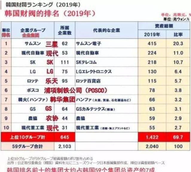 2019年,韩国前十大财阀占据了韩国GDP的69.7%。