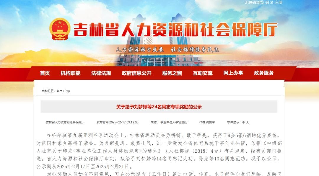 >>2月17日,吉林省人力资源和社会保障厅网站发布《关于给予刘梦婷等24名同志专项奖励的公示》,详情点击