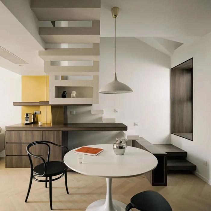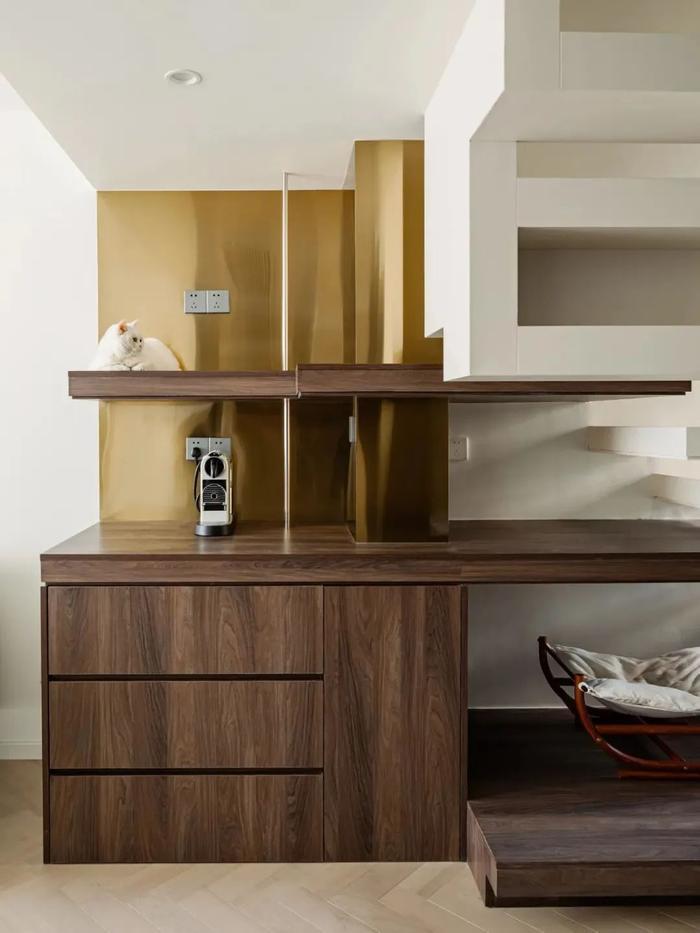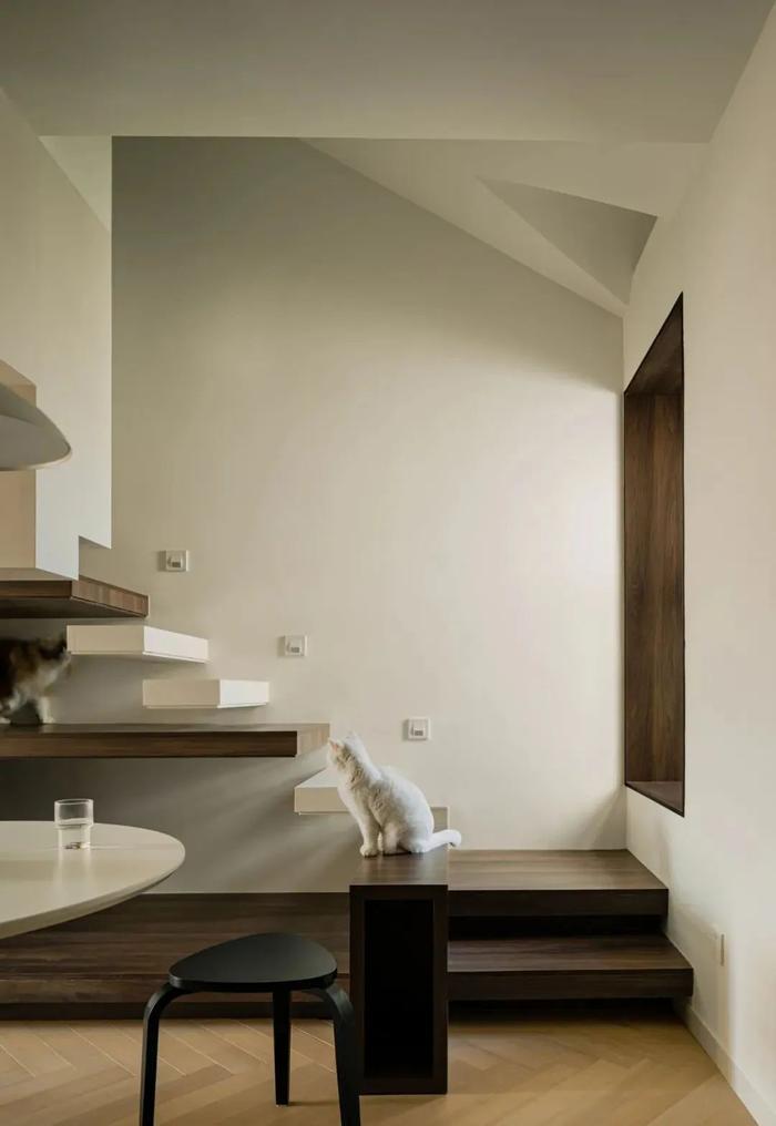 楼梯下方放置餐桌,餐边柜台面延伸到楼梯一侧,形成踏步。低处的踏步,成为摆放猫窝和喂食器的置物架。