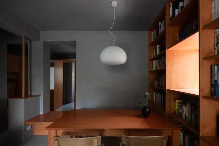 客餐厅区,窗洞像一个框景。书柜等都是设计好后,师傅现场制作的。吴状夫妇在施工过程中利用钢结构做了很多二次加固的措施