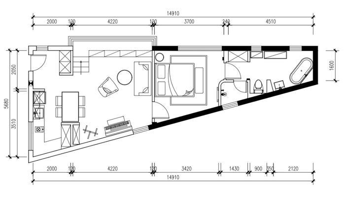 这间小小的城中度假屋是典型的单身公寓,整体呈长条三角形结构,越往里越窄。