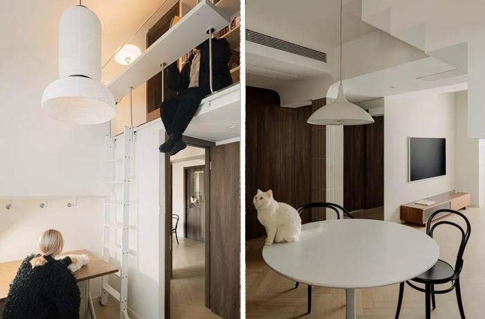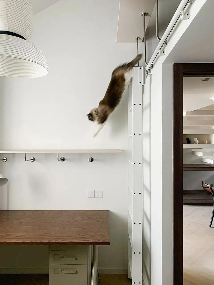 悬浮楼梯的间隙,也为它们提供了穿行通道和观望台。如此一来,楼梯叠合了餐边柜、书架、猫咪生活区的功能。