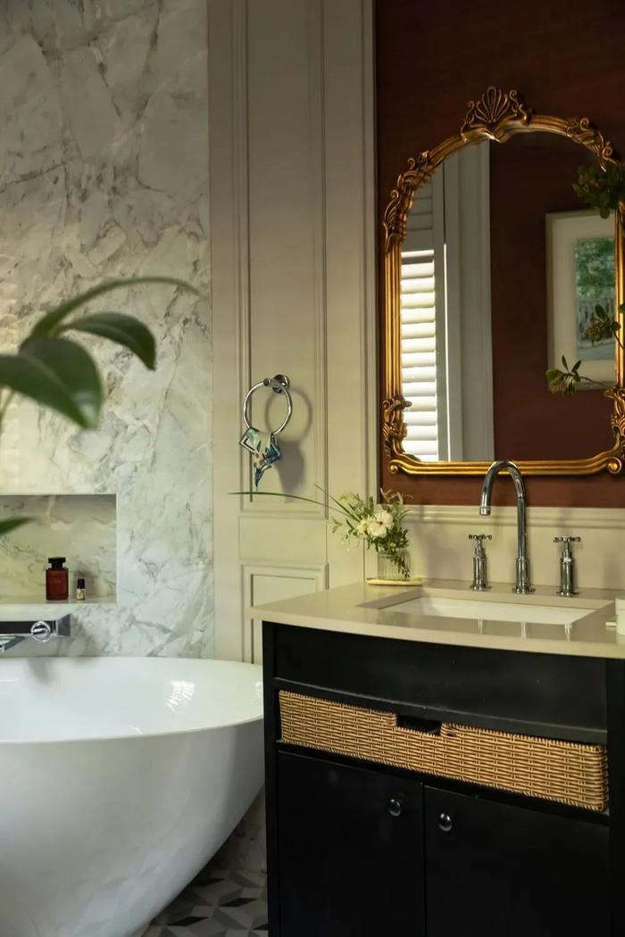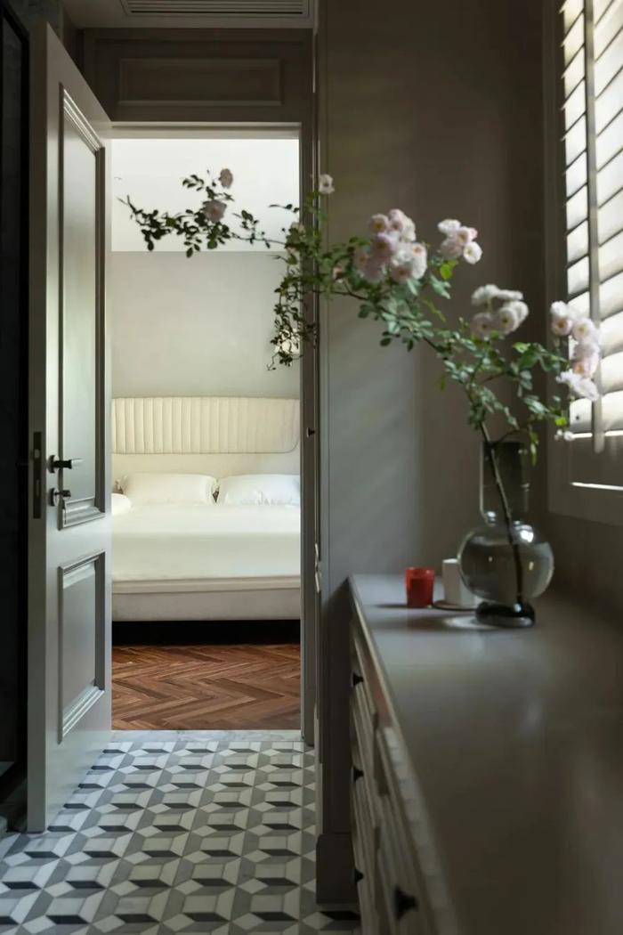 房子深处是主卧套房。卧室呈现出优雅素白的法式风格,而细节最丰富的要属卫生间,是深受朋友欢迎的“打卡地”。