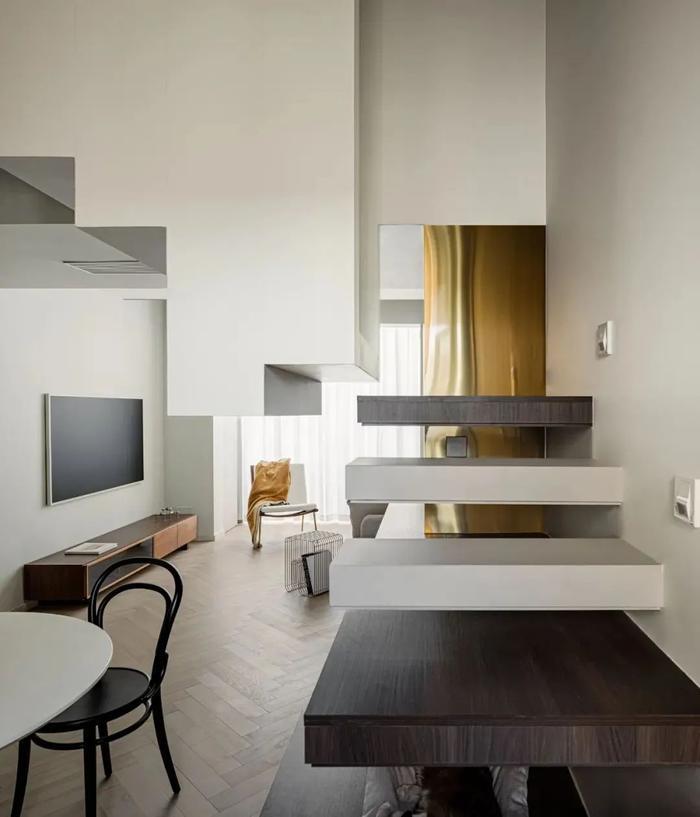 于是他们决定,在多功能区置入一个“Z字型”装置,这个装置就像集合了mini吧台、酒柜、厨房、家政间等等的大家具,不仅分隔、组织了生活空间,其内部大大小小的窗洞、门洞也使整个家更通透,同时又争取到了更多的收纳区域。