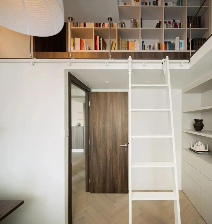 上下层书架足够承载夫妻俩的藏书需求。带轮子的爬梯平日可收纳在墙边,不影响底层通行。跨层取书时,通过爬梯上下,也为阅读增添了仪式感。