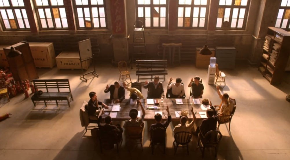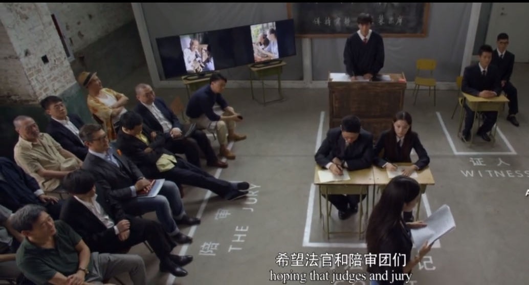 由十二人(或补考学生父亲,或亲属,或被拉来凑数的人)组成的陪审团,在庭审结束后,被要求在一间教室内,就庭审案件中嫌疑人是否有罪进行一小时的围桌讨论,最终得出全员一致通过的结论。