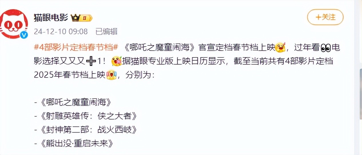 本以为2025春节档会继续“颓”下去,结果在12月10日,四部电影定档大年初一,它们制作精良、内容丰富,直接把观众的期待值拉满了。
