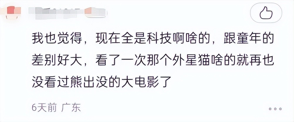 有网友认为,近些年熊出没这些大电影,全讲的是科技、未来、穿越等等,跟童年的差别非常大,网友看了一部之后,就再也不想看了。