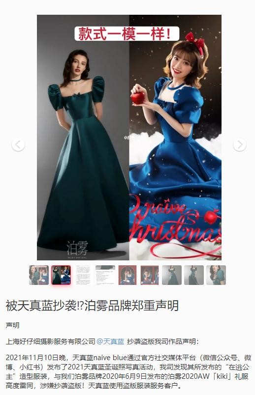 此外,天真蓝这次推出的圣诞系列主题照中有一款名为“在逃公主”的形象概念照,与某品牌2020年6月9日发布的礼服高度雷同,该品牌在小红书(社交软件)上发文声明,要求天真蓝销毁所有侵权产品,并对其作出公开赔礼道歉。