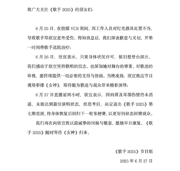 6月27日,《歌手2025》第7期节目如约而至。这一周是张榜赛,节目也迎来了郑欣宜、火星电台两组补位歌手。