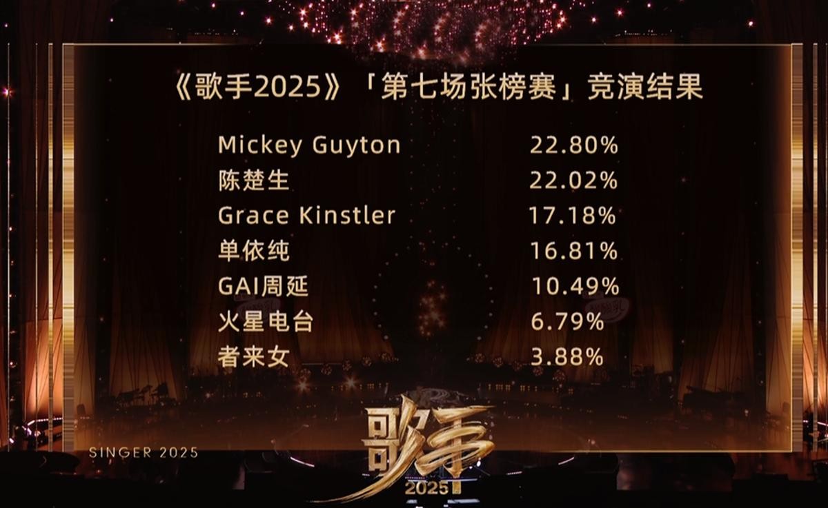 紧张激烈的比拼过后,《歌手2025》第7期的比赛结果也随之出炉——第1名米奇·盖顿、第2名陈楚生、第3名格瑞丝·金斯勒、第4名单依纯、第5名GAI、第6名火星电、第7名者来女。
