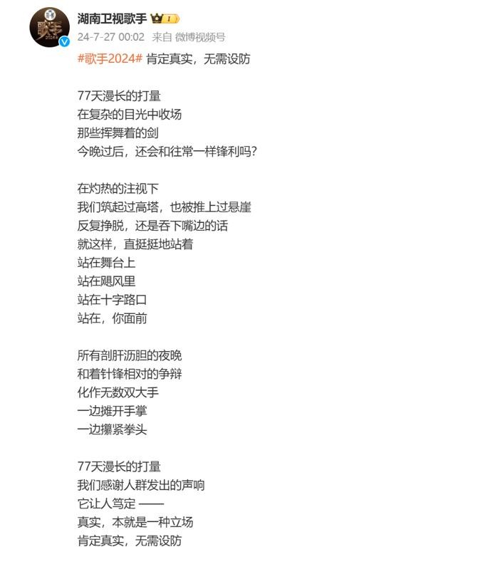 在网友热议之际,节目组于7月27日凌晨发布声明,对外界的质疑做出了有力回应。声明重申了比赛的真实性,强调音乐是无法被欺骗的。节目组表示:“我们相信每位参赛者都付出了心血,音乐本身就是一场公平的竞技,无论结果如何,重要的是每个人在这个过程中收获了什么。”