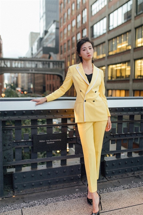 斓曦内搭黑色打底衫,外面穿了件黄色西装,与长裤搭配,带来活力抢眼视觉感受,更是将其帅气干练的职业风展示,脚踩细细尖头皮鞋,更是打造出御姐之风。
