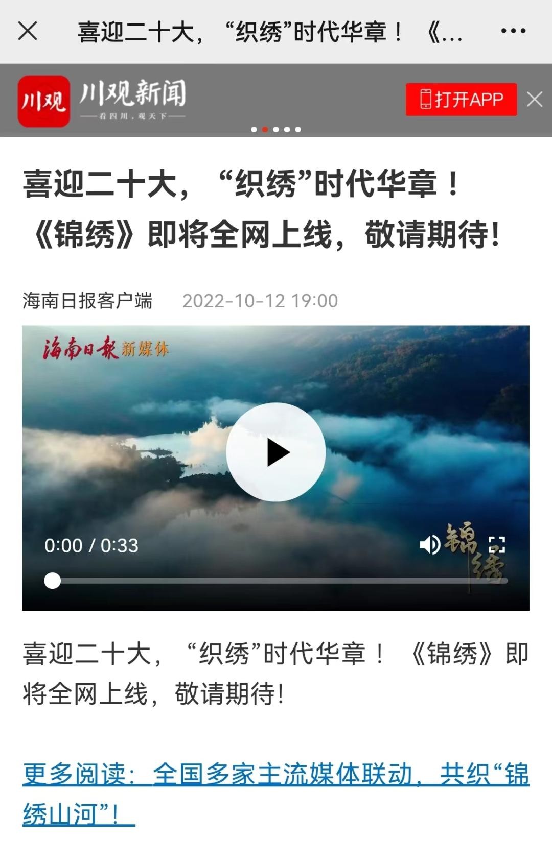 值得一提的是,本次《锦绣》预告片还获得了包括南方+APP、北京日报APP、新湖南客户端、浙江新闻客户端、川观新闻、江西新闻等近20家主流媒体转载支持,形成多方联动效应,营造出热烈的喜迎党的二十大氛围。