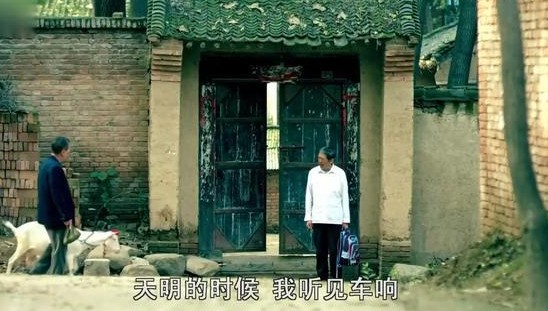 在影片6分50秒,老杨头提着布鲁克斯的书包,闭着地站在大门口张望。一个村里人牵着一头羊过来与他打招呼。这个镜头,从远处望过去,土墙、青瓦、木门、再加上门上撕掉的春联和门前相对矮小的老头,构成了一幅萧瑟的画面。在这个画面里,杨老头的形象似乎无比矮小,门框上被撕掉的春联,暗示着这个家已很久没过一个团圆年,他是一个在等亲人回家的孤独老人。