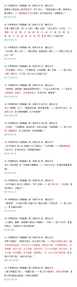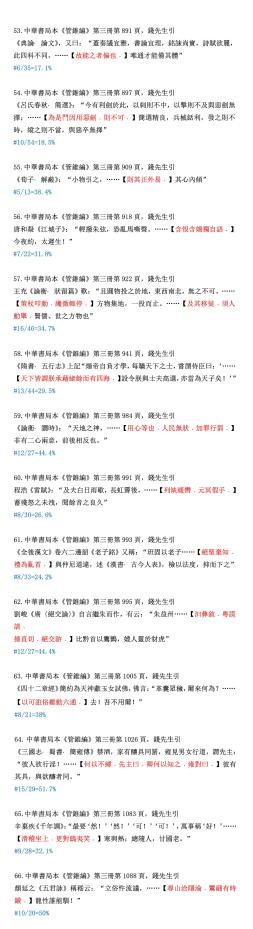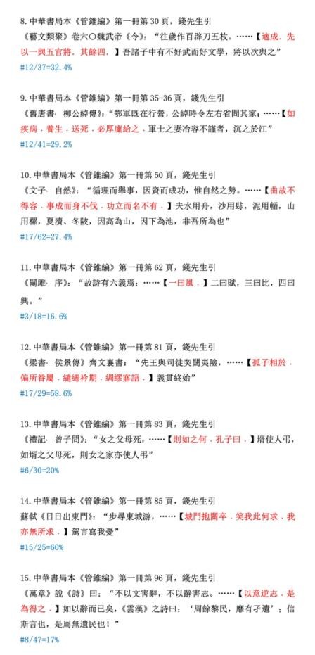 下边我们为读者随机录出100条例证,原样提供给读者选读。当然还须举出被删文字做参考。就是说读此材料,必须先认明以下凡例:“……”为中华本《管锥编》正文。其位置为编辑使用该符号的具体地方,下面的“【】”内为被删节的全部文字(本系统使用红色),原引文标点保持;再下面“#”单行,则为删除的字数和原有字数的比例。所有字数计算,不包括标点。读书不遵凡例,是不妥当的。违反了凡例的批评者,我不便答复,因那是不平等的对话。
