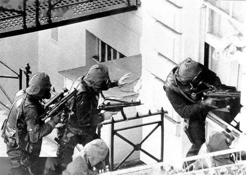 当时恐怖分子挟持了二十六名人质,在英国政府与之展开长达六天谈判之后,以一名人质被杀、一名人质被扔下楼去摔死终告失败。这时,S.A.S成员突然从天而降,破窗而入,迅速击毙六名恐怖分子其中的五个,成功救出余下二十四名人质,而整个行动过程仅仅用了十一分钟。