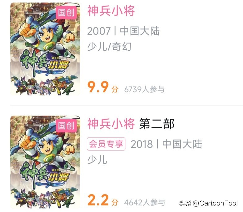 《神兵小将》动画第一季和第二季的B站分别是9.9分,2.2分;豆瓣第一季评分是9.0,第二季甚至没有出分,这个吐槽声也是不绝于耳了!